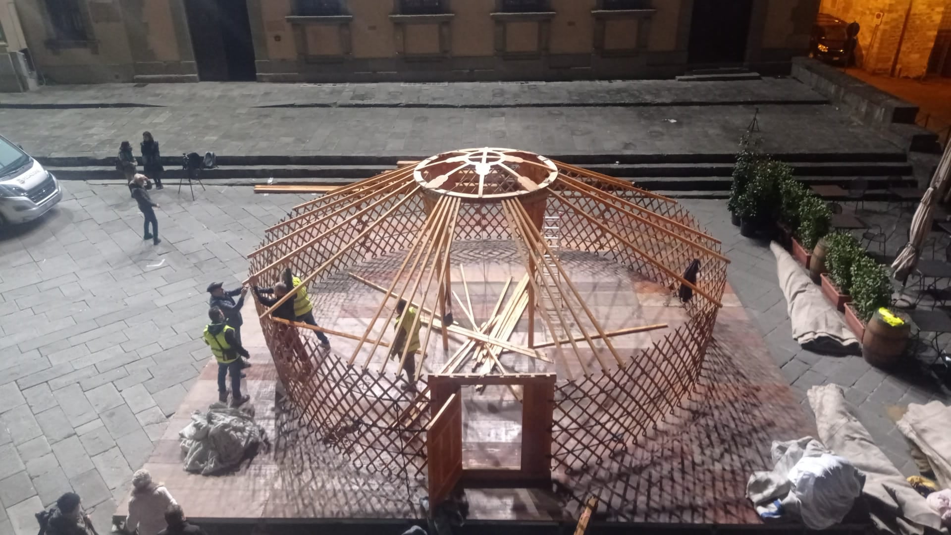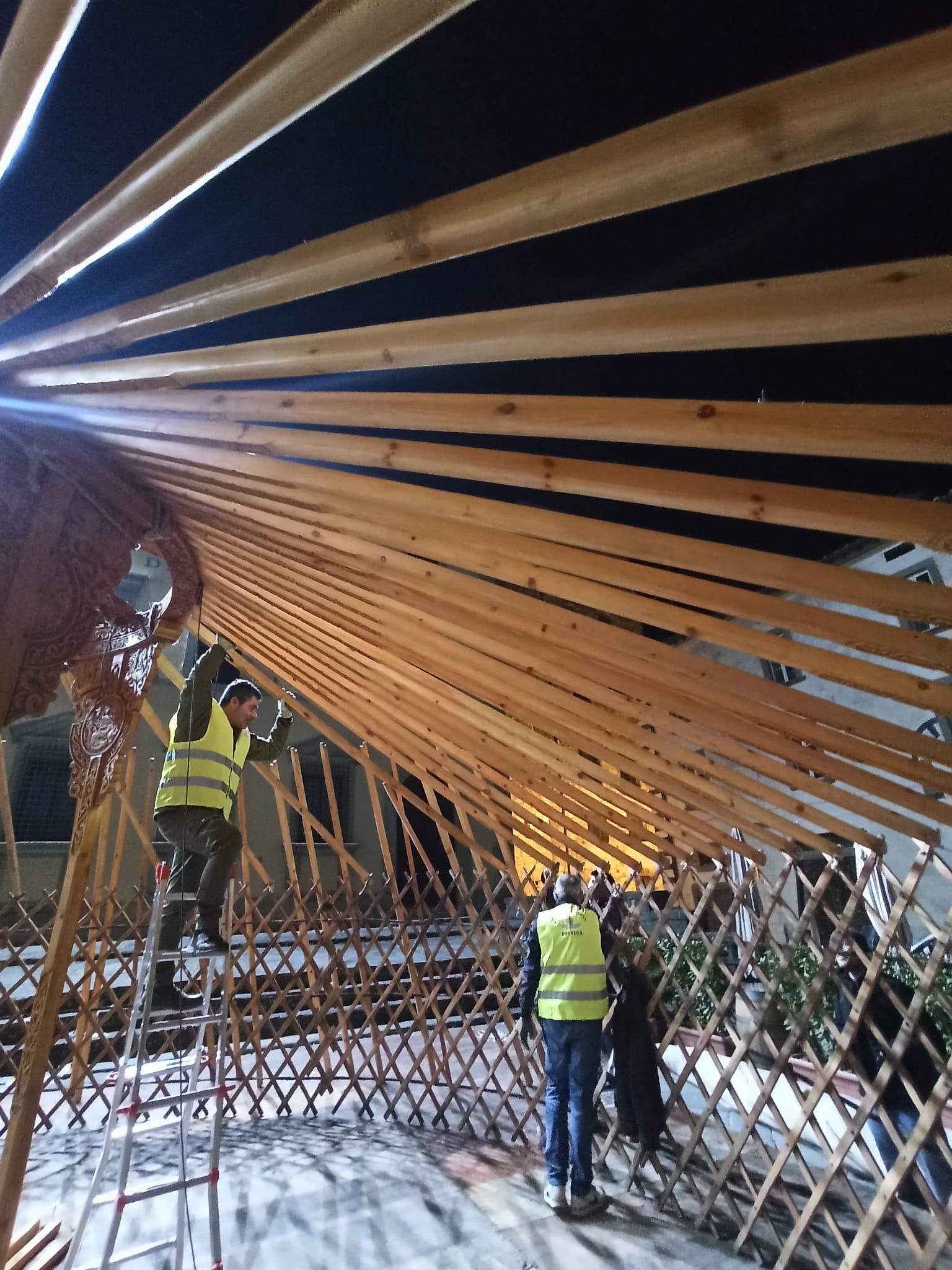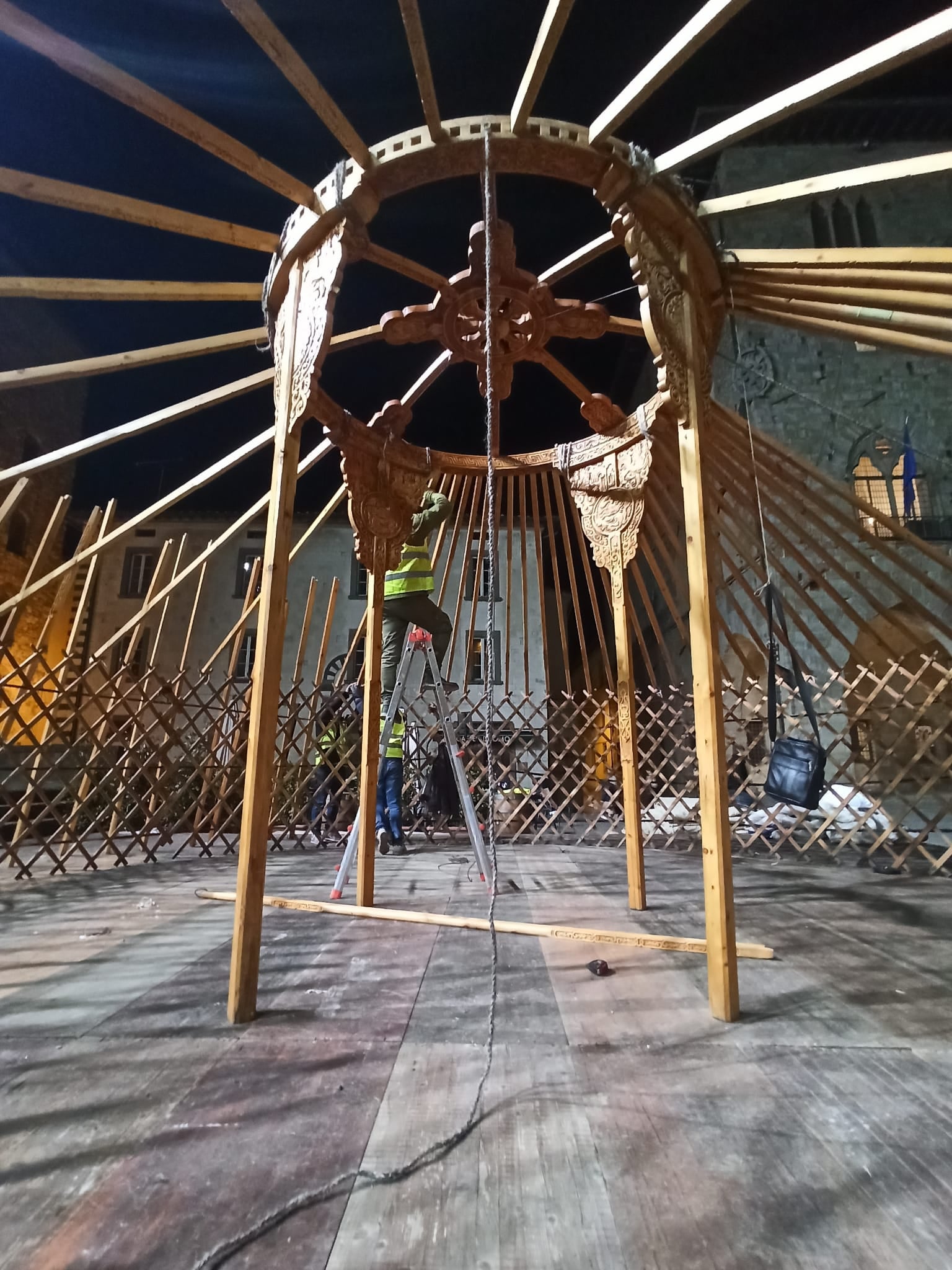 Stanotte, a tarda notte, abbiamo finito di montare la Yurta in Piazza del Duomo a Pistoia. Sono felice che finalmente gli architetti si pongano il problema di divulgare questo oggetto, la casa più antica del mondo, e che di fronte al montaggio ne abbiano capito a fondo il senso. La yurta si regge su un principio completamente diverso da quelli a cui siamo abituati in Occidente dove si costruisce con la forza, con il calcestruzzo: la yurta si regge sull’equilibrio, sull’elasticità, tanto che finché non si lega tutto insieme la sensazione è di non riuscire a gestirla!
